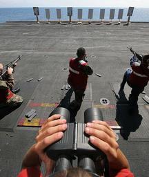 | Keywords: US Navy 050801-N-9907G-188 A firing line safety observer checks for target accuracy while Sailors fire M-16 machine guns from the kneeling position during a small-arms qualifications aboard the Nimitz-class aircraft carrier USS.jpg en Atlantic Ocean July 31 2005 - A firing line safety observer checks for target accuracy while Sailors fire M-16 machine guns from the kneeling position during a small-arms qualifications aboard the Nimitz-class aircraft carrier USS Harry S Truman CVN 75 Truman is conducting carrier qualifications and sustainment operations off the East Coast U S Navy photo by Photographer's Mate 2nd Class Floyd T Grimm RELEASED 2005-07-31 050801-N-9907G-188 Navy http //www navy mil/view_image asp id 26871 U S Navy photo by Photographer's Mate 2nd Class Floyd T Grimm PD-USGov-Military-Navy Aboard USS Harry S Truman CVN-75 Males with M16 rifle |