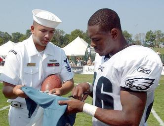 Keywords: US Navy 050811-N-4729H-171 Storekeeper 1st Class Washington Jaramillo assigned to Navy Recruiting District Philadelphia gets an autograph from Philadelphia Eagles cornerback Lito Sheppard.jpg en Lehigh Pa Aug 11 2005 - Storekeeper 1st Class Washington Jaramillo assigned to Navy Recruiting District Philadelphia gets an autograph from Philadelphia Eagles cornerback Lito Sheppard during the team's training camp The team sponsored a Military Appreciation Day for area military members featuring breakfast bleacher seats to watch practice and an autograph session after the morning session More than a hundred Sailors Marines Airmen and Soldiers from Pennsylvania and New Jersey bases were invited to participate U S Navy photo by Chief Journalist Monica Halman RELEASED 2005-08-11 050811-N-4729H-171 Navy http //www navy mil/view_image asp id 27213 U S Navy photo by Chief Journalist Monica Halman PD-USGov-Military-Navy Images from US Navy location Lehigh Pa Storekeeper Military Appreciation Day Lito Sheppard