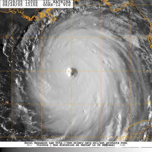 Keywords: US Navy 050828-N-0000W-002 GOES-12 Satellite image of Hurricane Katrina.jpg en Gulf of Mexico Aug 28 2005 GOES-12 Satellite image provided by the U S Naval Research Laboratory Monterey Calif showing the status of Hurricane Katrina at 1200Z or 7am EST The storm crossed South Florida Thursday and headed back to sea in the Gulf of Mexico The storm's wind has now increased to 160 mph a category 5 storm Only three Category 5 hurricanes the highest on the Saffir-Simpson scale have hit the United States since record keeping began The last was 1992's Hurricane Andrew which leveled parts of South Florida killed 43 people and caused 31 billion in damage The other two were the 1935 Labor Day hurricane that hit the Florida Keys and killed 600 people and Hurricane Camille which devastated the Mississippi coast in 1969 killing 256 Katrina was over the Gulf of Mexico about 250 miles south-southeast of the mouth of the Mississippi river at 7 a m local time according to an advisory posted on the U S National Hurricane Center's Web site The storm was moving toward the west-northwest at 12 mph U S Navy photo RELEASED 2005-08-28 050828-N-0000W-002 Navy http //www navy mil/view_image asp id 27442 U S Navy photo PD-USGov-Military-Navy Satellite pictures of Hurricane Katrina GOES 12 pictures |