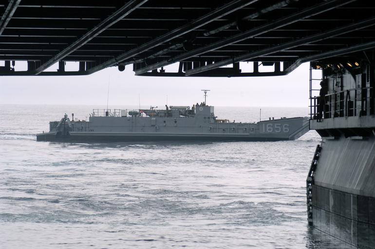 Keywords: US Navy 050831-N-1467R-030 A Landing Craft, Utility (LCU) assigned Assault Craft Unit Two (ACU-2), departs the well deck of the amphibious assault ship USS Bataan (LHD-5) bound for New Orleans.jpg en Gulf of Mexico Aug 31 2005 - A Landing Craft Utility LCU assigned Assault Craft Unit Two ACU-2 departs the well deck of the amphibious assault ship USS Bataan LHD-5 bound for New Orleans The LCU is loaded with sandbags water a small flat bottom boat 300 lifejackets a High Mobility Multipurpose Wheeled Vehicle HMMWV and enough supplies to last ten days as part of the relief efforts after Hurricane Katrina hit the Southern Gulf Coast States Bataan s involvement in the humanitarian assistance operations led by the Federal Emergency Management Agency FEMA in conjunction with the Department of Defense Bataan has been tasked to be the Maritime Disaster Relief Coordinator for the Navy s role in the relief efforts U S Navy photo by Photographer s Mate Airman Pedro A Rodriguez RELEASED 2005-08-31 050831-N-1467R-030 Navy http //www navy mil/view_image asp id 27537 U S Navy photo by Photographer s Mate Airman Pedro A Rodriguez PD-USGov-Military-Navy Aboard USS Bataan LHD-5 LCU 1656 ship 1970 Well decks |