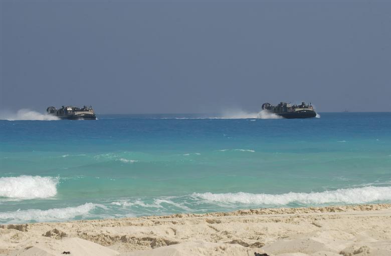 | Keywords: US Navy 050913-N-9288T-121 Two Landing Craft Air Cushion (LCAC) carrying U.S. Marines assigned to the 13th Marine Expeditionary Unit and Expeditionary Strike Group One from the USS Tarawa (LHA 1) ride along.jpg en Mubarek Military City Egypt - Two Landing Craft Air Cushion LCAC carrying U S Marines assigned to the 13th Marine Expeditionary Unit and Expeditionary Strike Group One from the amphibious assault ship USS Tarawa LHA 1 ride along the beach during a rehearsal for a scheduled amphibious assault landing later in the week as part of Bright Star Bright Star is multinational exercise held every two years in Egypt This exercise is the largest and most significant coalition military exercise conducted by U S Central Command USCENTCOM 2005-09-13 050913-N-9288T-121 Navy http //www navy mil/view_image asp id 28233 U S Navy photo by Photographer's Mate 2nd Class Brandon A Teeples PD-USGov-Military-Navy Bright Star 2005 United States Navy in Mubarak Military City Aboard USS Tarawa LHA-1 Landing Craft Air Cushion |