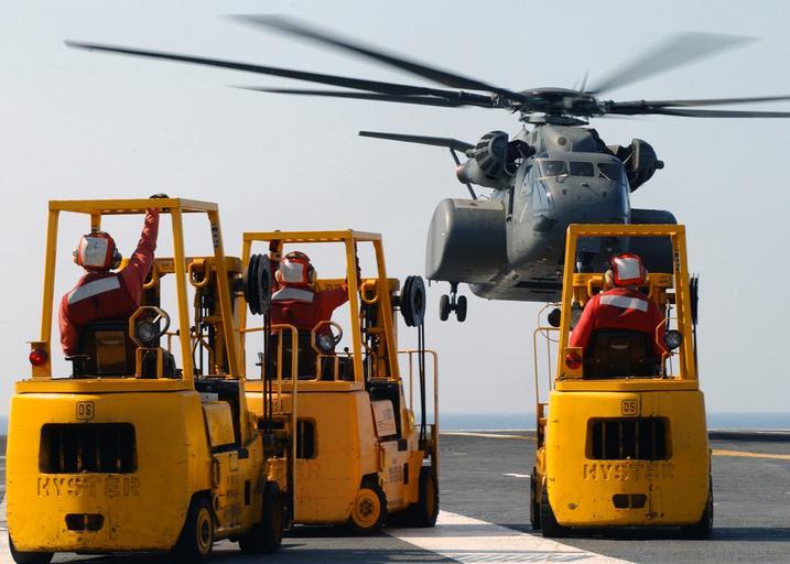 Keywords: US Navy 050913-N-0535P-073 Sailors manning forklifts prepare to load supplies into an MH-53 Sea Dragon helicopter on the flight deck aboard USS Harry S. Truman (CVN 75) in support of hurricane relief efforts.jpg en Gulf of Mexico Sept 13 2005 - Sailors manning forklifts prepare to load supplies into an MH-53 Sea Dragon helicopter on the flight deck aboard USS Harry S Truman CVN 75 in support of hurricane relief efforts The Nimitz class aircraft carrier is currently deployed to the Gulf Coast in support of Hurricane Katrina operations The Navy's involvement in the Hurricane Katrina humanitarian assistance operations are led by the Federal Emergency Management Agency FEMA in conjunction with the Department of Defense U S Navy photo by Photographer's Mate 3rd Class Jay C Pugh RELEASED 2005-09-13 050913-N-0535P-073 Navy http //www navy mil/view_image asp id 28185 U S Navy photo by Photographer's Mate 3rd Class Jay C Pugh PD-USGov-Military-Navy Aboard USS Harry S Truman CVN-75 Sikorsky MH-53E Sea Dragon in flight Military forklifts