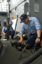 | Keywords: US Navy 050926-N-1960H-004 Aviation Ordnanceman Airman Thai Yang, foreground, and Aviation Ordnanceman Airman Reni Araque, both assigned to the weapons department, perform weekly maintenance on 50 cal. gun mounts.jpg en Yokosuka Japan Sept 26 2005 - Aviation Ordnanceman Airman Thai Yang foreground and Aviation Ordnanceman Airman Reni Araque both assigned to the weapons department perform weekly maintenance on machine gun mounts on the fantail aboard the conventionally powered aircraft carrier USS Kitty Hawk CV 63 U S Navy photo by Photographer's Mate Airman Thomas J Holt RELEASED 2005-09-26 050926-N-1960H-004 Navy http //www navy mil/view_image asp id 28588 U S Navy photo by Photographer's Mate Airman Thomas J Holt PD-USGov-Military-Navy Aviation Ordnanceman United States Fleet Activities Yokosuka Aboard USS Kitty Hawk CV-63 Maintenance of military equipment |