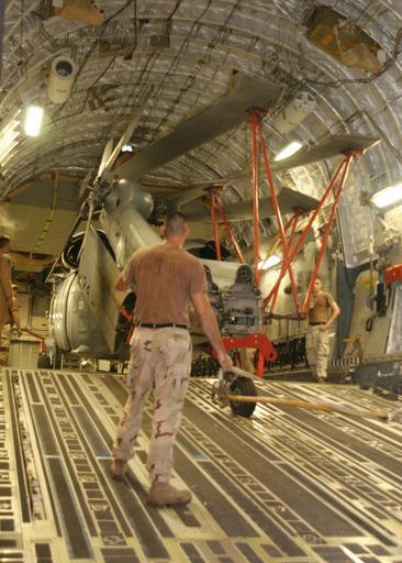 Keywords: US Navy 051015-N-5863B-003 U.S. Navy helicopter loaded onto transport aircraft bound for Pakistan earthquake relief efforts.jpg en Manama Bahrain Oct 15 2005 - Aviation Structural Mechanic Devon Kimble a native of Denver Colo controls the tension and direction of an MH-60S Seahawk helicopter as it is loaded onto a U S Air Force C-17 Globemaster III Oct 15 The Seahawk belonging to Helicopter Sea Combat Squadron Two Six HSC-26 will help deliver medical supplies water and tents to earthquake victims in Pakistan In addition to providing support as part of maritime security operations in the region the squadron will deploy 25 Sailors and two MH-60S helicopters to help those in need in Pakistan The United States government is participating in a multinational humanitarian assistance and support effort lead by the Pakistani Government to bring aid to victims of the devastating earthquake that struck the region Oct 8 2005 U S Navy photo by Photographer s Mate 2nd Class Kim Bennett RELEASED 2005-10-15 051015-N-5863B-003 Navy http //www navy mil/view_image asp id 28936 U S Navy photo by Photographer s Mate 2nd Class Kim Bennett PD-USGov-Military-Navy 2005 Kashmir earthquake relief efforts US Navy in Manama Bahrain Cabins of Boeing C-17 Globemaster III MH-60S Seahawk Transport of helicopters by Boeing C-17 Globemaster III Helicopter Sea Combat Squadron 26 United States Navy |
