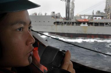 Keywords: US Navy 051111-N-1332Y-079 Seaman Maria Garcia observes and reports the progress of a replenishment at sea to the bridge.jpg en Pacific Ocean Nov 11 2005 - Seaman Maria Garcia observes and reports the progress of a replenishment at sea to the bridge while standing as a phone talker from the hangar bay aboard the conventionally powered aircraft carrier USS Kitty Hawk CV 63 U S Navy photo by Photographer's Mate Airman Adam York RELEASED 2005-11-11 051111-N-1332Y-079 Navy http //www navy mil/view_image asp id 29864 U S Navy photo by Photographer's Mate Airman Adam York PD-USGov-Military-Navy Underway replenishment Aboard USS Kitty Hawk CV-63 |