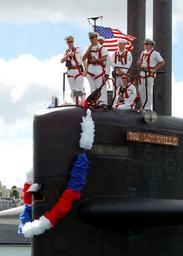 | Keywords: US Navy 051116-N-0879R-002 Crew members aboard the Los Angeles-class fast attack submarine USS Louisville (SSN 724) man the submarine^rsquo,s sail as they return to Naval Station Pearl Harbor, Hawaii.jpg  en Pearl Harbor Hawaii Nov 16 2005 Crew members aboard the Los Angeles-class fast attack submarine USS Louisville SSN 724 man the submarine s sail as they return to Naval Station Pearl Harbor Hawaii Louisville is returning from a regularly scheduled six-month deployment to the Western Pacific While underway Louisville participated in exercise Talisman Saber off the coast of Australia and Ship Anti-Submarine Warfare Readiness and Evaluation Measurement SHAREM exercises with the Japan Maritime Self Defense Force U S Navy photo by Chief Journalist David Rush RELEASED 2005-11-16 051116-N-0879R-002 Navy http //www navy mil/view_image asp id 29962 U S Navy photo by Chief Journalist David Rush PD-USGov-Military-Navy USS Louisville SSN-724 at Pearl Harbor Submarine sails Ship nameplates |