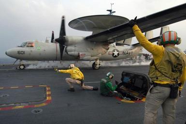 | Keywords: US Navy 051129-N-8604L-040 Catapult shooters signal to launch an E-2C Hawkeye.jpg en Pacific Ocean Nov 29 2005 Catapult shooters signal to launch an E-2C Hawkeye assigned to the Liberty Bells of Carrier Airborne Early Warning Squadron One One Five VAW-115 off the flight deck of the conventionally powered aircraft carrier USS Kitty Hawk CV 63 during cyclic flight operations Kitty Hawk and embarked Carrier Air Wing Five CVW-5 are currently conducting operations in the Western Pacific Ocean U S Navy photo by Photographer's Mate Airman Joshua Wayne LeGrand RELEASED 2005-11-29 051129-N-8604L-040 Navy http //www navy mil/view_image asp id 30318 U S Navy photo by Photographer's Mate Airman Joshua Wayne LeGrand PD-USGov-Military-Navy Aboard USS Kitty Hawk CV-63 Northrop Grumman E-2C Hawkeye aircraft carrier take-offs Airborne Early Warning Squadron 115 United States Navy |