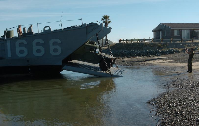 Keywords: US Navy 051205-N-9866B-033 A U.S. Marine directs a humvee out of Landing Craft, Utility One Six Six Six (LCU-1666) assigned to Amphibious Craft Unit One (ACU-1).jpg en Pacific Ocean Dec 5 2005 - A U S Marine directs a humvee out of Landing Craft Utility One Six Six Six LCU-1666 assigned to Amphibious Craft Unit One ACU-1 after arriving from the well deck of the amphibious assault ship USS Peleliu LHA 5 LCU-1666 dropped off Marines assigned to the 11th Marine Expeditionary Unit and their supplies on Del Mar Boat Base Camp Pendleton Calif Peleliu and Expeditionary Strike Group Three ESG-3 are underway off the coast of Southern California conducting their COMPTUEX in preparation for a regularly scheduled deployment U S Navy photo by Journalist 2nd Class Zack Baddorf RELEASED 2005-12-05 051205-N-9866B-033 Navy http //www navy mil/view_image asp id 30599 U S Navy photo by Journalist 2nd Class Zack Baddorf PD-USGov-Military-Navy Aboard USS Peleliu LHA-5 LCU 1666 ship 1971 |