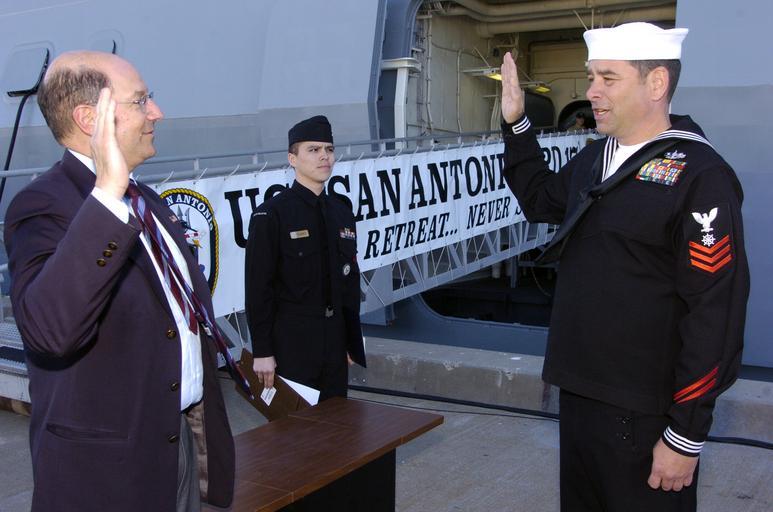 Keywords: US Navy 060113-N-2568S-100 Secretary of the Navy, Dr. Donald C. Winter administers the oath of reenlistment to Quartermaster 1st Class Thomas E. Dowling on the pier.jpg en Ingleside Texas Jan 13 2006 - Secretary of the Navy Dr Donald C Winter administers the oath of reenlistment to Quartermaster 1st Class Thomas E Dowling on the pier next to the Navy s newest warship the amphibious transport dock ship USS San Antonio LPD 17 This was the first reenlistment performed by Dr Winter after becoming the Navy s 74th Secretary on Jan 3 Secretary Winter arrived at Naval Station Ingleside to attend the scheduled commissioning of USS San Antonio on Jan 14 U S Navy photo by Chief Journalist Craig P Strawser RELEASED 2006-01-13 060113-N-2568S-100 Navy http //www navy mil/view_image asp id 31239 U S Navy photo by Chief Journalist Craig P Strawser PD-USGov-Military-Navy San Patricio County Texas Aboard USS San Antonio LPD 17 Donald C Winter Reenlistment |