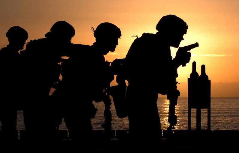| Keywords: US Navy 060114-N-9866B-002 Marines assigned to the 11th Marine Expeditionary Unit (MEU) fire 9mm handguns on the flight deck of the amphibious assault ship USS Peleliu (LHA 5).jpg en Pacific Ocean Jan 14 2006 - Marines assigned to the 11th Marine Expeditionary Unit MEU fire 9mm handguns on the flight deck of the amphibious assault ship USS Peleliu LHA 5 during a live-fire weapons qualification 11th MEU and Expeditionary Strike Group Three ESG-3 are underway off the coast of Southern California conducting their Joint Task Force Exercise JTFEX in preparation for an upcoming scheduled deployment U S Navy photo by Journalist 2nd Class Zack Baddorf RELEASED 2006-01-14 060114-N-9866B-002 Navy http //www navy mil/view_image asp id 31291 U S Navy photo by Journalist 2nd Class Zack Baddorf PD-USGov-Military-Navy Aboard USS Peleliu LHA-5 Silhouettes of men |