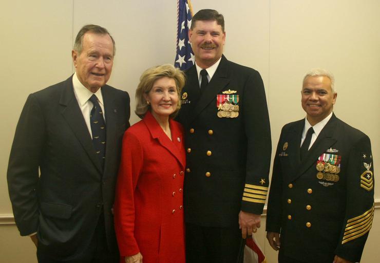 Keywords: US Navy 060114-N-0191T-056 41st President George H.W. Bush at USS San Antonio commissioning.jpg en Ingleside Texas Jan 14 2006 From left to right the 41st President of the United States the Honorable George H W Bush ship s sponsor for USS San Antonio LPD 17 Senator Kay Bailey Hutchison R-Tx pose with the ship s Commanding Officer Captain Jonathan M Padfield and Command Master Chief Willie De Santiago during a commissioning breakfast aboard ship As the first in her class USS San Antonio LPD 17 represents a key element of the Navy s seabase transformation Collectively San Antonio-class will functionally replace over 41 ships LPD 4 LSD 36 LKA 113 and LST 1179 classes of amphibious ships providing the Navy and Marine Corps with modern seabased platforms that are networked survivable and built to operate with 21st century transformational platforms such as the MV-22 Osprey the Expeditionary Fighting Vehicle EFV and future means by which Marines are delivered ashore U S Navy photo by Journalist 2nd Class Anthony C Tornetta RELEASED 2006-01-14 060114-N-0191T-056 Navy http //www navy mil/view_image asp id 31230 U S Navy photo by Journalist 2nd Class Anthony C Tornetta PD-USGov-Military-Navy Commissioning of USS San Antonio LPD-17 George H W Bush |
