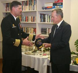 Keywords: US Navy 060114-N-0191T-066 USS San Antonio (LPD 17) Commanding Officer, Captain Jonathan M. Padfield presents the 41st President of the United States, the Honorable George H.W. Bush with an honorary ship^rsquo,s ball cap, durin.jpg en Ingleside Texas Jan 14 2006 - USS San Antonio LPD 17 Commanding Officer Captain Jonathan M Padfield presents the 41st President of the United States the Honorable George H W Bush with an honorary ship s ball cap during commissioning day aboard San Antonio President Bush provided the key address during the ceremony held on board Naval Station Ingleside As the first in her class USS San Antonio LPD 17 represents a key element of the Navy s seabase transformation Collectively San Antonio-class will functionally replace over 41 ships LPD 4 LSD 36 LKA 113 and LST 1179 classes of amphibious ships providing the Navy and Marine Corps with modern seabased platforms that are networked survivable and built to operate with 21st century transformational platforms such as the MV-22 Osprey the Expeditionary Fighting Vehicle EFV and future means by which Marines are delivered ashore U S Navy photo by Journalist 2nd Class Anthony C Tornetta RELEASED 2006-01-14 060114-N-0191T-066 Navy http //www navy mil/view_image asp id 31232 U S Navy photo by Journalist 2nd Class Anthony C Tornetta PD-USGov-Military-Navy Commissioning of USS San Antonio LPD-17 George H W Bush |