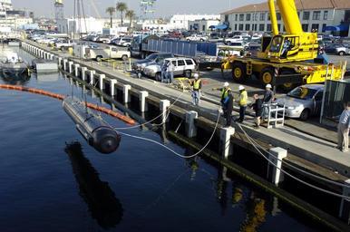 | Keywords: US Navy 060130-N-7676W-028 The Seahorse-class Autonomous Underwater Vehicle (AUV) from the applied research laboratory at Penn State University is lowered into the water prior to undergoing launch and recovery testing.jpg en San Diego Jan 30 2006 - The Seahorse-class Autonomous Underwater Vehicle AUV from the applied research laboratory at Penn State University is lowered into the water prior to undergoing launch and recovery testing with Sea Fighter FSF-1 At 28 feet six inches and weighing 10 800 pounds Seahorse is an untethered unmanned underwater robotic vehicle capable of pre-programmed independent operations The demonstration is sponsored by the Office of Naval Research ONR U S Navy photo by Mr John F Williams RELEASED 2006-01-30 060130-N-7676W-028 Navy http //www navy mil/view_image asp id 31625 U S Navy photo by Mr John F Williams PD-USGov-Military-Navy Naval Base San Diego in the 2000s Sea Fighter ship 2005 |
