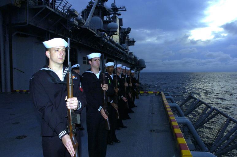 Keywords: US Navy 060131-N-5067K-047 A ceremonial rifle team stands at a port arms ready to render honors for the burial at sea of the of Chief Engineman James O'Hare Jr. USN Ret.jpg en East China Sea Jan 31 2006 - A ceremonial rifle team stands at a port arms ready to render honors for the burial at sea of the of Chief Engineman James O'Hare Jr USN Ret Chief Petty Officer O'Hare served in the Navy from 1942 to 1962 during World War ll and the Korean Conflict serving aboard the aircraft carrier USS Essex CV 9 the immediate predecessor to the current amphibious assault ship USS Essex LHD 2 currently serving the Navy today Honoring the request of Winifred O'Hare the widow of Chief O'Hare his remains were scattered to the Deep Blue Sea from the namesake of his much beloved ship U S Navy photo by Photographer's Mate 1st Class Michael D Kennedy RELEASED 2006-01-31 060131-N-5067K-047 Navy http //www navy mil/view_image asp id 31698 U S Navy photo by Photographer's Mate 1st Class Michael D Kennedy PD-USGov-Military-Navy M14 rifle at sea burials Aboard USS Essex LHD-2 |
