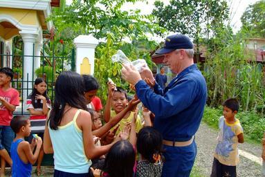 MAKE A MEME View Large Image Navy 060221-N-4772B-153 USS Harpers Ferry (LSD 49), Command Master Chief Darryl Brandt hands out candy to children in the small fishing village of Himbangen.jpg en Himbangan Philippines Feb 21 2006 - USS Harpers Ferry LSD 49 Command Master ...