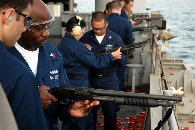 | Keywords: US Navy 060321-N-7130B-004 Sailors are instructed in the proper handling and use of a 12-guage shotgun during a familiarization firing exercise on the fantail of the Nimitz-class aircraft carrier USS Ronald Reagan (CVN 76).jpg en Persian Gulf March 21 2006 - Sailors are instructed in the proper handling and use of a 12-guage shotgun during a familiarization firing exercise on the fantail of the Nimitz-class aircraft carrier USS Ronald Reagan CVN 76 Reagan and embarked Carrier Air Wing One Four CVW-14 are currently on a deployment conducting Maritime Security Operations MSO in support of the global war on terrorism U S Navy photo by Photographer's Mate 3rd Class Aaron Burden RELEASED 2006-03-21 060321-N-7130B-004 Navy http //www navy mil/view_image asp id 32971 U S Navy photo by Photographer's Mate 3rd Class Aaron Burden PD-USGov-Military-Navy Firearms training on USS Ronald Reagan CVN-76 Males with shotguns Mossberg 500 |