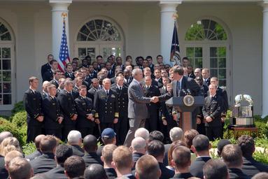 | Keywords: US Navy 060425-N-9909C-007 President George W. Bush shakes hands with the Navy football coach Paul Johnson during the official presentation of the Commander In Chief Trophy to the U.S Naval Academy football team at the White Ho.jpg en Washington D C April 19 2004 - President George W Bush shakes hands with the Navy football coach Paul Johnson during the official presentation of the Commander In Chief Trophy to the U S Naval Academy football team at the White House Rose Garden The Commander In Chief s trophy is awarded to the service with the best inter-service football record This is the third consecutive year Navy has won the trophy U S Navy photo by Cmdr Jane Campbell RELEASED 2004-04-19 060425-N-9909C-007 Navy http //www navy mil/view_image asp id 33874 U S Navy photo by Cmdr Jane Campbell PD-USGov-Military-Navy West Colonnade White House W White House Rose Garden |