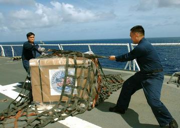 | Keywords: US Navy 060509-N-3714J-054 Two Sailors prepare boxes to be air lifted in support of Project Handclasp from Military Sealift Command (MSC) hospital ship USNS Mercy (T-AH 19).jpg en Pacific Ocean May 9 2006 - Storekeeper 3rd Class Christian Sabandal of Los Angeles Calif and Storekeeper 3rd Class Rommer Gonzales of San Diego Calif prepare boxes to be air lifted in support of Project Handclasp from Military Sealift Command MSC hospital ship USNS Mercy T-AH 19 Mercy is on a five-month deployment during which it will visit areas of South Asia Southeast Asia and the Pacific Islands where its crew and several health and civic-related organizations will work together to aid in humanitarian assistance and civic efforts Project Handclasp accepts and transports educational humanitarian and goodwill material overseas on a space-available basis in U S Navy ships Materials are distributed directly to needy recipients by U S service personnel stationed in overseas areas or embarked on U S Navy ships which visit these areas Mercy is uniquely capable of supporting medical and humanitarian assistance needs and is configured with special medical equipment and a robust multi-specialized medical team to provide a range of services ashore as well as aboard the ship The medical staff is augmented with an assistance crew many of whom are part of non-governmental organizations which have significant medical capabilities U S Navy photo by Photographer's Mate 2nd Class Erika N Jones RELEASED 2006-05-09 060509-N-3714J-054 Navy http //www navy mil/view_image asp id 34356 U S Navy photo by Photographer's Mate 2nd Class Erika N Jones PD-USGov-Military-Navy Aboard USNS Mercy T-AH-19 Project Handclasp United States Navy |