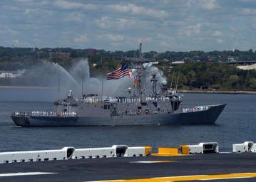 | Keywords: US Navy 060524-N-1371G-036 The destroyer USS Ramage (DDG 46) passes port side of the amphibious assault ship USS Kearsarge (LHD 3) while entering New York Harbor during the parade of ships, Fleet New York Week 2006.jpg en New York Harbor May 24 2006 The guided missile frigate USS Klakring FFG 42 passes port side of the amphibious assault ship USS Kearsarge LHD 3 while entering New York Harbor during the parade of ships Fleet New York Week 2006 Fleet Week has been sponsored by New York City since 1984 in celebration of the United States sea service The annual event also provides an opportunity for citizens of New York City and the surrounding Tri-State area to meet Sailors and Marines as well as witness first hand the latest capabilities of today s Navy and Marine Corps team Fleet week includes dozens of military demonstrations and displays including public tours of many of the participating ships U S Navy photo by Photographer s Mate 2nd Class Valerie S Guffey RELEASED 2006-05-24 060524-N-1371G-036 Navy http //www navy mil/view_image asp id 34866 U S Navy photo by Photographer s Mate 2nd Class Valerie S Guffey PD-USGov-Military-Navy Fleet Week New York 2006 Ships demonstrating water cannons New York Harbor Aboard USS Kearsarge LHD-3 Ships entering port |