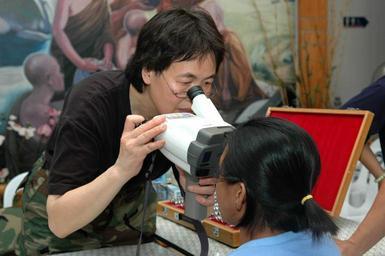 Keywords: US Navy 060527-N-3714J-063 USNS Mercy - Deployment 2006.jpg en Zamboanga Republic of the Philippines May 27 2006 - Air Force Lt Col Doris Wong of Las Vegas Nev performs an eye exam for a patient at the Zamboanga Medical Center Wong attached to U S Naval hospital ship USNS Mercy T-AH 19 helped with over 250 eye exams and distributed 200 pairs of glasses to the local residents of Zamboanga Mercy is on a five-month humanitarian deployment to South Asia Southeast Asia and the Pacific Islands The medical crew aboard Mercy will also provide general and ophthalmology surgery basic medical evaluation and treatment preventive medicine treatment dental screenings and treatment optometry screenings eyewear distribution public health training and veterinary services as requested by the host nations Like all U S Naval forces Mercy is able to rapidly respond to a range of situations on short notice Mercy is uniquely capable of supporting medical and humanitarian assistance needs and is configured with special medical equipment and a robust multi-specialized medical team who can provide a range of services ashore as well as aboard the ship The medical staff is augmented with an assistance crew many of whom are part of non-governmental organizations which have significant medical capabilities U S Navy photo by Photographer's Mate 2nd Class Erika N Jones RELEASED 060527-N-3714J-063 Navy http //www navy mil/view_image asp id 35117 U S Navy photo by Photographer's Mate 2nd Class Erika N Jones PD-USGov-Military-Navy United States Navy in Zamboanga City Aboard USNS Mercy T-AH-19 People of the United States Air Force Optometry |