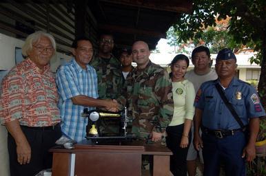| Keywords: US Navy 060530-N-8391L-192 U.S. Navy Lt. Steve Aboona presents Zamboanga Mayor Celso Lobregat an antique sewing machine during a Medical-Dental Civil Action Program (MEDCAP) held by the Military Sealift Command (MSC) Hospital s.jpg en Zamboanga Philippines May 30 2006 - U S Navy Lt Steve Aboona presents Zamboanga Mayor Celso Lobregat an antique sewing machine during a Medical/Dental Civil Action Program MEDCAP held by the Military Sealift Command MSC Hospital ship USNS Mercy T-AH 19 MEDCAPs are an integral part of Mercy's humanitarian mission and provide a multitude of medical dental and veterinary care for the people who live in this region Mercy is embarked on a humanitarian deployment to South and Southeast Asia and the Pacific Islands Mercy is able to rapidly respond to a range of situations on short notice and is capable of supporting medical and humanitarian assistance needs with special medical equipment and a multi-specialized medical team providing a range of services ashore as well as aboard the ship The medical staff is augmented with an assistance crew many of whom are part of non-governmental organizations that have significant medical capabilities U S Navy photo by Photographer's Mate 2nd Class Troy Latham RELEASED 2006-05-30 060530-N-8391L-192 Navy http //www navy mil/view_image asp id 35342 U S Navy photo by Photographer's Mate 2nd Class Troy Latham PD-USGov-Military-Navy United States Navy in Zamboanga City Aboard USNS Mercy T-AH-19 |