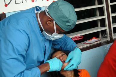 | Keywords: US Navy 060530-N-3153C-010 U.S. Navy Lt. James Harris, a dentist aboard the U.S. Military Sealift Command (MSC) hospital ship, USNS Mercy (T-AH 19) examines the teeth of a young child during a Medical-Dental Civil Action Progra.jpg en Zamboanga Philippines May 30 2006 - U S Navy Lt James Harris a dentist aboard the U S Military Sealift Command MSC hospital ship USNS Mercy T-AH 19 examines the teeth of a young child during a Medical/Dental Civil Action Program MEDCAP Using an elementary school's facilities Mercy's Navy crew worked together with medical experts from various organizations and militaries to provide substantial medical care to over 1 200 residents MEDCAP personnel provided medical evaluation and treatments basic dental treatment vision exams and pharmacy drugs Mercy is on a five-month humanitarian deployment to areas in South Asia Southeast Asia and the Pacific Islands U S Navy photo by Journalist Seaman Joseph Caballero RELEASED 2006-05-30 060530-N-3153C-010 Navy http //www navy mil/view_image asp id 35287 U S Navy photo PD-USGov-Military-Navy Dentists at work United States Navy in Zamboanga City Aboard USNS Mercy T-AH-19 |