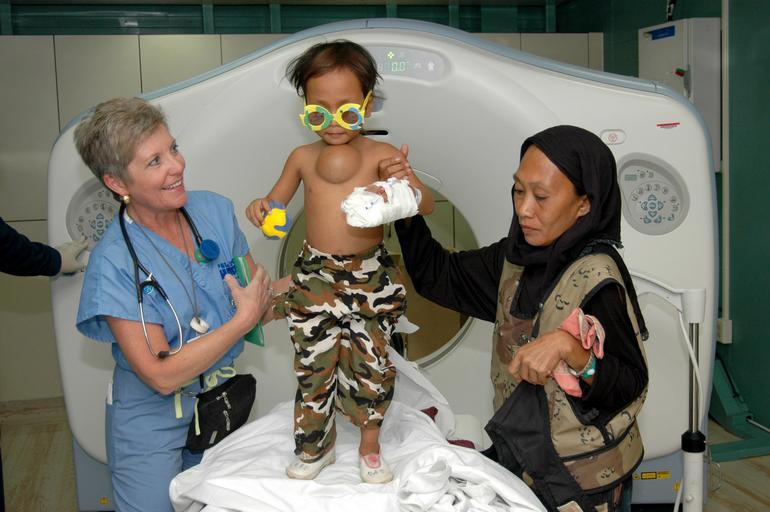 Keywords: US Navy 060604-N-2832L-048 Diane Speranza, a Project Hope volunteer and emergency room nurse assigned to casualty receiving, prepares a boy on his fifth birthday for doctors.jpg en Jolo Philippines June 4 2006 - Diane Speranza a Project Hope volunteer and emergency room nurse assigned to casualty receiving prepares a boy on his fifth birthday for doctors to tend to his anterior chest wall mass The boy and his mother arrived by helicopter for a stint aboard Mercy so its medical staff can take care of the boy and other Jolo families Jolo is U S Military Sealift Command MSC Hospital ship USNS Mercy s T-AH 19 second stop during the ship s scheduled five-month humanitarian aid mission to host nations in the Pacific Islands and south and Southeast Asia Mercy has already visited Zamboanga Philippines where its crew has treated several thousand patients in one week Helicopter Sea Combat Squadron Two Five HSC-25 is attached to Mercy and will provide medical evacuation for patients as well as a mode of transportation for medical personnel to reach the shore Mercy is uniquely capable of supporting medical and humanitarian assistance needs and is configured with special medical equipment and a robust multi-specialized medical team who can provide a range of services ashore as well as aboard the ship The medical staff is augmented with an assistance crew many of whom are part of nongovernmental organizations foreign militaries and other branches of U S military that have significant medical capabilities U S Navy photo by Journalist Seaman Apprentice Mike Leporati RELEASED 2006-06-04 060604-N-2832L-048 Navy http //www navy mil/view_image asp id 35439 U S Navy photo by Journalist Seaman Apprentice Mike Leporati PD-USGov-Military-Navy Images from US Navy location Jolo Philippines Aboard USNS Mercy T-AH-19 Helicopter Sea Combat Squadron 25 United States Navy |