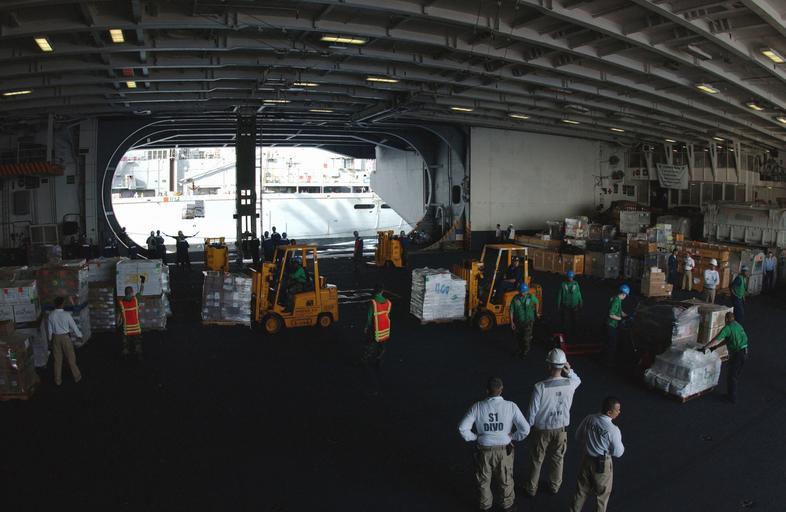 | Keywords: US Navy 060615-N-7526R-072 Deck and Supply Department personnel work to move cargo in the hangar bay of the Nimitz-class aircraft carrier USS Ronald Reagan (CVN 76) during an underway replenishment (UNREP) with the fast combat.jpg en Philippine Sea June 15 2006 - Deck and Supply Department personnel work to move cargo in the hangar bay of the Nimitz-class aircraft carrier USS Ronald Reagan CVN 76 during an underway replenishment UNREP with the fast combat support ship USNS Rainier T-AOE 7 Reagan and embarked Carrier Air Wing One Four CVW-14 are currently on a regularly scheduled deployment in support of the global war on terrorism as well as conducting Maritime Security Operations U S Navy photo by Journalist 3rd Class Marc Rockwell-Pate RELEASED 2006-06-15 060615-N-7526R-072 Navy http //www navy mil/view_image asp id 35840 U S Navy photo by Journalist 3rd Class Marc Rockwell-Pate PD-USGov-Military-Navy Underway replenishment Hangar bays of USS Ronald Reagan CVN-76 |