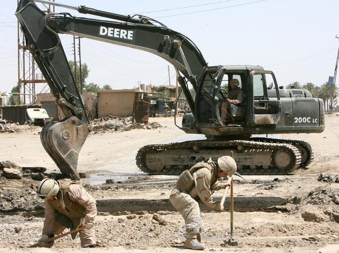| Keywords: US Navy 060616-N-9712C-007 Seabees assigned to Naval Mobile Construction Battalion Four Zero (NMCB-40) were tasked with rebuilding a damaged bridge used heavily by Iraqi citizens.jpg en Fallujah Iraq June 16 2006 - Seabees assigned to Naval Mobile Construction Battalion Four Zero NMCB-40 were tasked with rebuilding a damaged bridge used heavily by Iraqi citizens NMCB-40 is currently deployed providing support to Coalition Multi-National Forces throughout Iraq U S Navy photo by Photographer's Mate 3rd Class John P Curtis RELEASED 2006-06-16 060616-N-9712C-007 Navy http //www navy mil/view_image asp id 36249 U S Navy photo by Photographer's Mate 3rd Class John P Curtis PD-USGov-Military-Navy Fallujah in the Iraq War Naval Mobile Construction Battalion 40 John Deere excavators Tracked 360 degree diggers United States Navy in the Iraq War Shoveling Men at work Excavators in Iraq John Deere military vehicles |