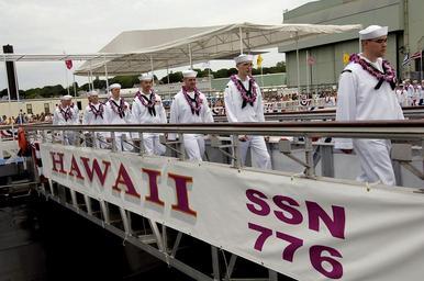 Keywords: US Navy 060617-N-3642E-006 Sailors assigned to the Virginia-class nuclear attack submarine Pre-Commissioning Unit (PCU) Hawaii (SSN 776) depart after participating in the ship's christening ceremony.jpg en Groton Conn Jun 17 2006 - Sailors assigned to the Virginia-class nuclear attack submarine Pre-Commissioning Unit PCU Hawaii SSN 776 depart after participating in the ship's christening ceremony Hawaii is the third Virginia-class submarine to be christened and the 1st major U S Navy combatant vessel class designed with the post-Cold War security environment in mind and embodies the war fighting and operational capabilities required to dominate the littorals while maintaining undersea dominance in the open ocean U S Navy photo by Photographer's Mate 1st Class Shawn P Eklund RELEASED 2006-06-17 060617-N-3642E-006 Navy http //www navy mil/view_image asp id 35915 U S Navy photo by Photographer's Mate 1st Class Shawn P Eklund PD-USGov-Military-Navy Naval Submarine Base New London Ship christenings in the United States Navy USS Hawaii SSN-776 |