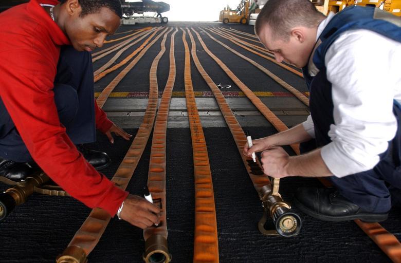 Keywords: US Navy 060617-N-5549O-104 Aviation Boatswain's Mate 3rd Class Larry Barron, left, and Aviation Boatswain's Mate Airman Matthew Hutchens prepare fire hoses for a hydrostatic test.jpg en Philippine Sea June 17 2006 - Aviation Boatswain's Mate 3rd Class Larry Barron left and Aviation Boatswain's Mate Airman Matthew Hutchens prepare fire hoses for a hydrostatic test that will determine the accurate water pressure and integrity of each hose aboard the Nimitz-class aircraft carrier USS Ronald Reagan CVN 76 Ronald Reagan and Carrier Air Wing One Four CVW-14 are currently on a regularly scheduled deployment in support of the global war on terrorism and maritime security operations MSO and participating in Exercise Valiant Shield 2006 Valiant Shield focuses on integrated joint training among U S military forces enabling real-world proficiency in sustaining joint forces and in detecting locating tracking and engaging units at sea in the air on land and cyberspace in response to a range of mission areas U S Navy photo by Photographer's Mate 3rd Class Kevin S O'Brien RELEASED 2006-06-17 060617-N-5549O-104 Navy http //www navy mil/view_image asp id 35918 U S Navy photo by Photographer's Mate 3rd Class Kevin S O'Brien PD-USGov-Military-Navy Aviation Boatswain's Mates Valiant Shield 2006 Aboard USS Ronald Reagan CVN-76 |