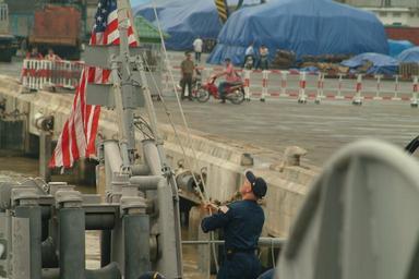 | Keywords: US Navy 060701-N-4124C-046 Mineman 1st Class Christopher Corleone, assigned to the mine countermeasures ship USS Patriot (MCM 7), shifts colors as the ship moor.jpg en Saigon River July 1 2006 - Mineman 1st Class Christopher Corleone assigned to the mine countermeasures ship USS Patriot MCM 7 shifts colors as the ship moor in Ho Chi Minh City for a scheduled port visit Visits to Vietnam by U S Navy ships symbolize the continuation of relations between the two nations Sailors from Patriot and the rescue and salvage ship USS Salvor ARS 52 will have an opportunity to interact with the Vietnamese people through a variety of events including a community service project at a local orphanage and a volleyball game with Navy division of the People's Army of Vietnam PAVN U S Navy Photo by Mass Communication Specialist Adam R Cole RELEASED 2006-07-01 060701-N-4124C-046 Navy http //www navy mil/view_image asp id 36401 U S Navy Photo by Mass Communication Specialist Adam R Cole PD-USGov-Military-Navy Images from US Navy location Saigon River Mineman |
