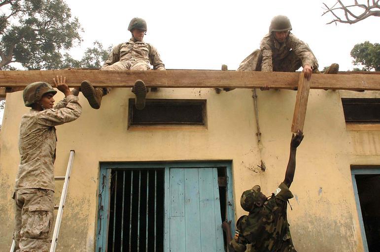 | Keywords: US Navy 060810-N-9500T-139 Marines assigned to Bridge Co. A, 6th Engineering Battalion and soldiers of the Ugandan Peoples Defense Force work together to build a new roof for the Nurses Cottage.jpg en Serere Uganda Aug 10 2006 - Marines assigned to Bridge Co A 6th Engineering Battalion and soldiers of the Ugandan Peoples' Defense Force work together to build a new roof for the Nurses' Cottage during a Medical Civil Action Program MEDCAP as part of Exercise Natural Fire Natural Fire is the largest combined exercise between Eastern African community nations and the United States It will include medical veterinary and engineering civic affairs programs in addition to military exercises U S photo by Mass Communication Specialist 2nd Class Scott Taylor RELEASED 2006-08-10 060810-N-9500T-139 Navy http //www navy mil/view_image asp id 38320 U S Navy photo PD-USGov-Military-Navy Images from US Navy location Serere Uganda United States Marine Corps in Uganda |