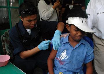 | Keywords: US Navy 060812-N-3931M-072 Navy Hospitalman Renie Charifa embarked with the Medical Treatment Facility aboard the Military Sealift Command (MSC) hospital ship USNS Mercy (T-AH 19), administers an immunization shot to a local ch.jpg en Tarakan Indonesia Aug 12 2006 - Navy Hospitalman Renie Charifa embarked with the Medical Treatment Facility aboard the Military Sealift Command MSC hospital ship USNS Mercy T-AH 19 administers an immunization shot to a local child at the Karang Rejo Puskemas-Outreach during the ship s visit to the city Mercy is currently off the coast to provide humanitarian and civic assistance to the people of this small island Mercy is in the fourth month of her five-month humanitarian and civic assistance deployment to South and Southeast Asia where her crew has already treated thousands of people U S Navy photo by Mass Communication Specialist 1st Class Michael R McCormick RELEASED 2006-08-12 060812-N-3931M-072 Navy http //www navy mil/view_image asp id 38020 U S Navy photo by Mass Communication Specialist 1st Class Michael R McCormick PD-USGov-Military-Navy Images from US Navy location Tarakan Indonesia |