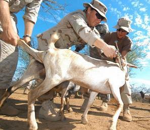 Keywords: US Navy 060815-N-0411D-018 U.S. Army Veterinarian, Capt Gwynne Kinley of Cape Elizabeth, Maine, immunizes a goat with the help of U.S. Navy Operations Specialist 2nd Class Jessica Silva.jpg en Chemeril Kenya Aug 15 2006 - U S Army Veterinarian Capt Gwynne Kinley of Cape Elizabeth Maine immunizes a goat with the help of U S Navy Operations Specialist 2nd Class Jessica Silva right of Houston Texas and U S Marine Lance Cpl Darrrell Brandes of Goliad Texas During exercise Natural Fire over 2000 sheep and goats were vaccinated against Sheep Pox and Pleural Pneumonia at a Veterinary Civil Assistance Project VETCAP operated by U S Kenyan Tanzanian and Ugandan veterinarians and doctors Natural Fire is the largest combined exercise between Eastern African community nations and the United States and includes medical veterinary and engineering civic affairs programs U S Navy photo by Mass Communication Specialist 2nd Class Roger S Duncan RELEASED 2006-08-15 060815-N-0411D-018 Navy http //www navy mil/view_image asp id 38793 U S Navy photo by Mass Communication Specialist 2nd Class Roger S Duncan PD-USGov-Military-Navy Images from US Navy location Chemeril Kenya Goats Veterinarians from the United States Veterinary vaccinations Women in the United States Navy Women in the United States Army 2006 in Kenya |