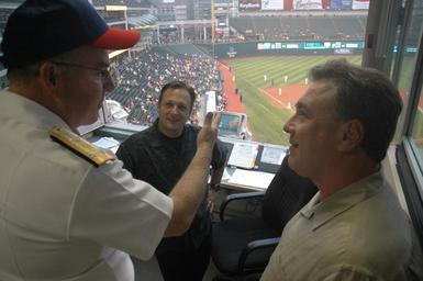 | Keywords: US Navy 060828-N-1805P-007 Chief of Naval Personnel Vice Adm. John C. Harvey Jr. chats with broadcasters from Cleveland radio station WTAM 1100 AM during a Major League Baseball game at Jacobs Field between the Cleveland Indian.jpg en Cleveland Ohio Aug 28 2006 - Chief of Naval Personnel Vice Adm John C Harvey Jr chats with broadcasters Tom Hamilton and Matt Underwood from the Cleveland Indians Radio Network during a Major League Baseball game at Jacobs Field between the Cleveland Indians and Toronto Blue Jays Harvey administered the oath reenlisting to 15 Sailors assigned to Navy Operational Support Center Cleveland on the field before the game He also threw out the ceremonial first pitch Vice Adm Harvey was participating in events kicking off Cleveland Navy Week 2006 which runs Aug 28-Sep 4 Twenty-six such weeks are planned this year in cities throughout the U S arranged by the Navy Office of Community Outreach NAVCO The mission of NAVCO is to enhance the Navy's brand image in areas with limited exposure to the Navy U S Navy photo by Mass Communication Specialist 1st Class Jason J Perry RELEASED 2006-08-28 060828-N-1805P-007 Navy http //www navy mil/view_image asp id 38590 U S Navy photo by Mass Communication Specialist 1st Class Jason J Perry PD-USGov-Military-Navy Progressive Field Radio personalities from the United States Images from US Navy location Cleveland Ohio John C Harvey Jr WTAM Cleveland Navy Week |