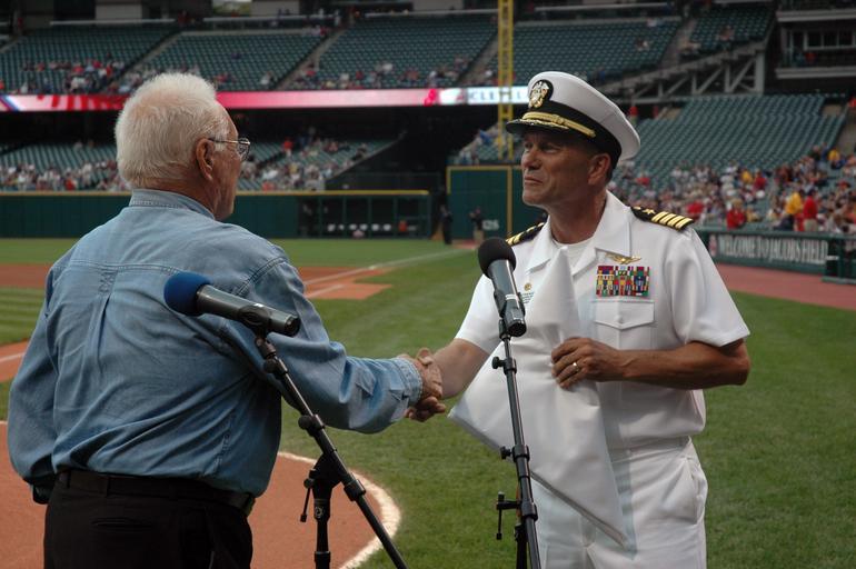 | Keywords: US Navy 060830-N-1805P-006 Amphibious transport dock ship USS Cleveland (LPD 7) Commanding Officer Capt. Frank McCulloch accepts a Cleveland Indians flag presented to him by Major League Baseball Hall of Fame Inductee and World.jpg en Cleveland Ohio Aug 30 2006 - Amphibious transport dock ship USS Cleveland LPD 7 Commanding Officer Capt Frank McCulloch accepts a Cleveland Indians flag presented to him by Major League Baseball Hall of Fame Inductee and World War II Navy veteran Bob Feller before the start of the Major League Baseball game between the Indians vs Toronto Blue Jays The original flag presented to Feller by Mculloch had been flown aboard the USS Cleveland for nearly a decade In gratitude Feller presented McCulloch and other Cleveland Sailors with a new Indians flag on behalf of the city of Cleveland and Indians organization Cleveland Sailors are in their ship's namesake town for Cleveland Navy Week festivities Twenty-six such Navy Weeks are planned this year in cities throughout the U S arranged by the Navy Office of Community Outreach NAVCO The mission of NAVCO is to enhance the Navy's brand image in areas with limited exposure to the Navy U S Navy photo by Mass Communication Specialist 1st Class Jason J Perry RELEASED 2006-08-30 060830-N-1805P-006 Navy http //www navy mil/view_image asp id 38688 U S Navy photo by Mass Communication Specialist 1st Class Jason J Perry PD-USGov-Military-Navy USS Cleveland LPD-7 Bob Feller Progressive Field Images from US Navy location Cleveland Ohio Cleveland Navy Week |