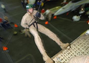 Keywords: US Navy 061127-N-8907D-005 Navy Diver 1st Class John Doran with Explosive Ordnance Disposal Mobile Unit 6 (EODMU-6), Detachment 16, conducts repel and insertion training.jpg en Arabian Sea Nov 27 2006 - Navy Diver 1st Class John Doran with Explosive Ordnance Disposal Mobile Unit 6 EODMU-6 Detachment 16 conducts repel and insertion training from a platform in the hangar bay aboard the Nimitz-class aircraft carrier USS Dwight D Eisenhower CVN 69 Eisenhower and embarked Carrier Air Wing CVW-7 are on a regularly scheduled deployment in support of Maritime Security Operations U S Navy photo by Mass Communication Specialist Seaman David Danals RELEASED 2006-11-27 061127-N-8907D-005 Navy http //www navy mil/view_image asp id 41162 U S Navy photo by Mass Communication Specialist Seaman David Danals PD-USGov-Military-Navy United States Navy Explosive Ordnance Disposal Aboard USS Dwight D Eisenhower CVN-69 United States Navy Divers Explosive Ordnance Disposal Mobile Unit 6 |
