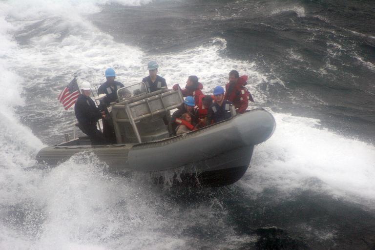 | Keywords: US Navy 061201-N-6423H-009 A boat crew from the amphibious transport dock ship USS San Antonio (LPD 17) returns to the ship after rescuing the crew of the fishing vessel Miss Melissa.jpg en Atlantic Ocean Dec 1 2006 - A boat crew from the amphibious transport dock ship USS San Antonio LPD 17 returns to the ship after rescuing the crew of the fishing vessel Miss Melissa which was taking on water in heavy seas and 40-knot winds The ship s Commanding Officer Cmdr Brad Lee answered Miss Melissa s distress call immediately deploying a crew of five personnel in a ridged hull inflatable boat RHIB to retrieve the crew later sending a team back to the fishing vessel to assist with dewatering efforts The Coast Guard later towed the boat back to port The rescued crew was brought aboard San Antonio and provided dry clothing food and an opportunity to make phone calls home U S Navy photo by Mass Communication Specialist 1st Class Erik Hoffmann RELEASED 2006-12-01 061201-N-6423H-009 Navy http //www navy mil/view_image asp id 41273 U S Navy photo by Mass Communication Specialist 1st Class Erik Hoffmann PD-USGov-Military-Navy Aboard USS San Antonio LPD 17 |