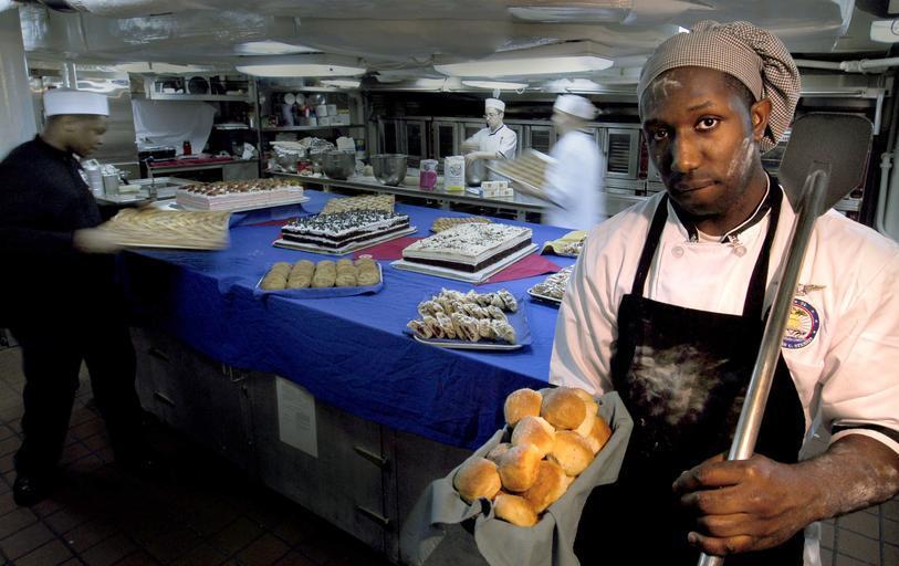 | Keywords: US Navy 070227-N-3729H-092 Culinary Specialist 3rd Class Ugene Ward, head baker aboard USS John C. Stennis (CVN 74), displays a pan of fresh rolls.jpg en ARABIAN SEA Feb 27 2007 - Culinary Specialist 3rd Class Ugene Ward head baker aboard USS John C Stennis CVN 74 displays a pan of fresh rolls while fellow bakers are busy preparing fresh baked goods ranging from cakes to hand-rolled cinnamon buns for approximately 5 000 Sailors Stennis Carrier Strike Group is on a scheduled deployment in support of Maritime Security Operations MSO U S Navy photo by Mass Communication Specialist 3rd Class Jon Hyde RELEASED 2007-02-27 070227-N-3729H-092 Navy http //www navy mil/view_image asp id 43557 U S Navy photo by Mass Communication Specialist 3rd Class Jon Hyde PD-USGov-Military-Navy Culinary specialist United States Navy Food preparation aboard USS John C Stennis CVN-74 |