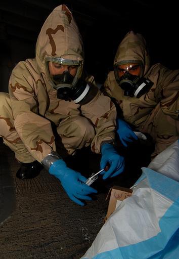 Keywords: US Navy 070321-N-7780S-015 Damage Controlman 3rd Class Hunter Young, left, and Shawn Dunaway take samples from a mock anthrax pile during a Chemical, Biological, Radiological (CBR) decontamination drill.jpg en PERSIAN GULF March 21 2007 - Damage Controlman 3rd Class Hunter Young left and Shawn Dunaway take samples from a mock anthrax pile during a Chemical Biological Radiological CBR decontamination drill aboard Nimitz-class aircraft carrier USS John C Stennis CVN 74 Stennis Carrier Strike Group is on deployment in support of Maritime Security Operations MSO U S Navy photo by Mass Communication Specialist Seaman Apprentice Kyle Steckler RELEASED 2007-03-21 070321-N-7780S-015 Navy http //www navy mil/view_image asp id 44346 U S Navy photo by Mass Communication Specialist Seaman Apprentice Kyle Steckler PD-USGov-Military-Navy Damage Controlman Aboard USS John C Stennis CVN-74 Nuclear warfare Biological warfare and Chemical warfare MCU-2/P Protective Mask Military protective clothing People wearing gas masks |