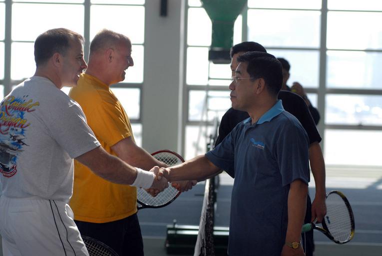 | Keywords: US Navy 070323-N-2959L-025 USS Ronald Reagan (CVN 76) Commanding Officer, Capt. Terry Kraft and Cmdr. James Hineline shake hands before beginning a tennis match.jpg en BUSAN Republic of Korea March 23 2007 - USS Ronald Reagan CVN 76 Commanding Officer Capt Terry Kraft and Cmdr James Hineline shake hands before beginning a tennis match with Republic of Korea Capt Kang Hee Kak commanding officer of Yangmanchun DDH 973 Ronald Reagan Carrier Strike Group arrived in Busan for a port visit in conjunction with Exercise Reception Staging Onward Movement and Integration/Foal Eagle RSOI/FE 2007 U S Navy photo by Mass Communication Specialist 2nd Class Dominique M Lasco RELEASED 2007-03-23 070323-N-2959L-025 Navy http //www navy mil/view_image asp id 44357 U S Navy photo by Mass Communication Specialist 2nd Class Dominique M Lasco PD-USGov-Military-Navy Foal Eagle 2007 Images from US Navy location BUSAN Korea Aboard USS Ronald Reagan CVN-76 Terry Kraft Handshakes in sports Handshakes involving the military |
