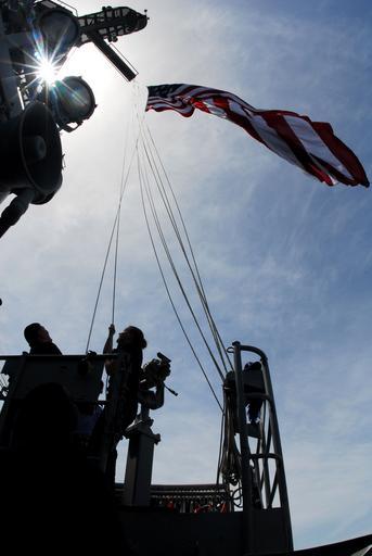 Keywords: US Navy 070323-N-9928E-021 Sailors from navigation department hoist the American flag aloft from the signal bridge aboard Nimitz-class aircraft carrier USS John C. Stennis (CVN 74).jpg en ARABIAN SEA March 23 2007 - Sailors from navigation department hoist the American flag aloft from the signal bridge aboard Nimitz-class aircraft carrier USS John C Stennis CVN 74 Stennis Carrier Strike Group is on deployment in support of Maritime Security Operations MSO U S Navy photo by Mass Communication Specialist Seaman Josue Lepoldo Escobosa RELEASED 2007-03-23 070323-N-9928E-021 Navy http //www navy mil/view_image asp id 44374 U S Navy photo by Mass Communication Specialist Seaman Josue Lepoldo Escobosa PD-USGov-Military-Navy Aboard USS John C Stennis CVN-74 Flag hoisting |