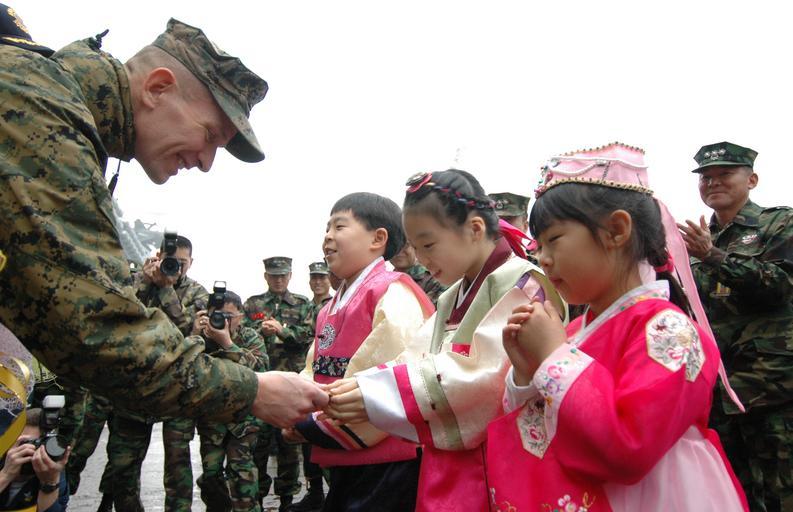 | Keywords: US Navy 070324-N-4207M-009 Marine Corps Col. John Mayer, commanding officer of the 31st Marine Expeditionary Unit, presents a challenge coin to a child wearing traditional Korean garments during exercise Foal Eagle 2007.jpg  en POHANG Republic of Korea March 24 2007 - Marine Corps Col John Mayer commanding officer of the 31st Marine Expeditionary Unit presents a challenge coin to a child wearing traditional Korean garments during exercise Foal Eagle 2007 Foal Eagle is an annually scheduled exercise involving forces from the U S and the Republic of Korea ROK to improve combat readiness through interoperability U S Navy photo by Mass Communication Specialist 3rd Class Jhoan Montolio RELEASED 2007-03-24 070324-N-4207M-009 Navy http //www navy mil/view_image asp id 44379 U S Navy photo by Mass Communication Specialist 3rd Class Jhoan Montolio PD-USGov-Military-Navy Pohang Foal Eagle 2007 |