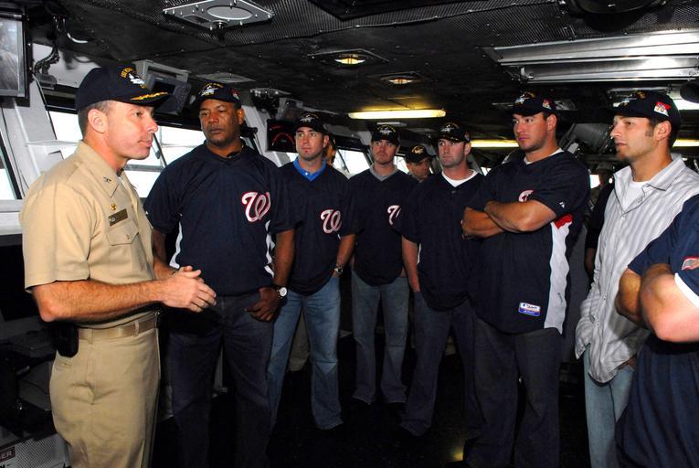 Keywords: US Navy 070501-N-3659B-179 USS Ronald Reagan (CVN 76) Commanding Officer, Capt. Terry B. Kraft, explains bridge operations to representatives of the Washington Nationals baseball team.jpg en CORONADO Calif May 1 2007 - USS Ronald Reagan CVN 76 Commanding Officer Capt Terry B Kraft explains bridge operations to representatives of the Washington Nationals baseball team The Nationals toured Ronald Reagan participated in an autograph session and had lunch with Sailors Ronald Reagan is currently undergoing Planned Incremental Availability in her homeport of San Diego U S Navy photo by Mass Communication Specialist 2nd Class Joseph M Buliavac RELEASED 2007-05-01 070501-N-3659B-179 Navy http //www navy mil/view_image asp id 45663 U S Navy photo by Mass Communication Specialist 2nd Class Joseph M Buliavac PD-USGov-Military-Navy Terry Kraft Bridge of USS Ronald Reagan CVN-76 Washington Nationals players 2007 Washington Nationals season Guests aboard USS Ronald Reagan CVN-76