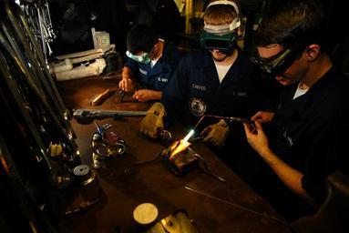 Keywords: US Navy 070514-N-2659P-144 Hull Technician Fireman Noah Rodriguez, left, performs tool maintenance while Hull Technician Fireman Zach Carver, center, assists Hull Technician Fireman Keir Burnette with brazing.jpg en ARABIAN SEA May 14 2007 - Hull Technician Fireman Noah Rodriguez left performs tool maintenance while Hull Technician Fireman Zach Carver center assists Hull Technician Fireman Keir Burnette with brazing a fitting for a saltwater pipe in the metal shop aboard Nimitz-class aircraft carrier USS John C Stennis CVN 74 John C Stennis Carrier Strike Group is on deployment in support of Maritime Security Operations MSO U S Navy photo by Mass Communication Specialist 3rd Class Paul J Perkins RELEASED 2007-05-14 070514-N-2659P-144 Navy http //www navy mil/view_image asp id 46159 U S Navy photo by Mass Communication Specialist 3rd Class Paul J Perkins PD-USGov-Military-Navy Brazing Aboard USS John C Stennis CVN-74 Hull Maintenance Technician United States Navy |