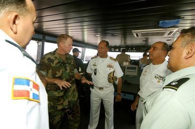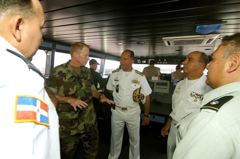Keywords: US Navy 070624-N-0989H-079 Capt. Douglas Wied, commander, Task Group 40.9, gives Valm Julio Cesar Ventura Bayonet, Valm Ivam Pena Castillo of the Dominican Republic Navy a tour of High Speed Vessel (HSV) 2 Swift.jpg en CARIBBEAN SEA June 24 2007 - Capt Douglas Wied commander Task Group 40 9 gives Valm Julio Cesar Ventura Bayonet Valm Ivam Pena Castillo of the Dominican Republic Navy a tour of High Speed Vessel HSV 2 Swift Task Group 40 9 TG 40 9 is deployed as part of the pilot Global Fleet Station GFS to the Caribbean basin and Central America The mission is designed to validate the GFS concept for the Navy and support U S Southern Command objectives for its area of responsibility by enhancing cooperative partnerships with regional maritime services and improving operational readiness for the participating partner nations U S photo by Mass Communication Specialist 1st Class David Hoffman RELEASED 2007-06-24 070624-N-0989H-079 Navy http //www navy mil/view_image asp id 47487 U S Navy photo PD-USGov-Military-Navy Aboard HSV-2 Swift |