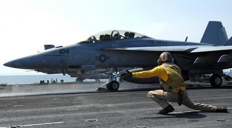 Keywords: US Navy 070704-N-8923M-165 Lt. Beau Massenburg signals the catapult operator to launch an F-A-18F Super Hornet, attached to the.jpg en ATLANTIC OCEAN July 4 2007 - Plane shooter Lt Beau Massenburg signals the catapult operator to launch an F/A-18F Super Hornet attached to the Red Rippers of Strike Fighter Squadron VFA 105 off the bow of Nimitz-class aircraft carrier USS Harry S Truman CVN 75 Truman is underway participating in the composite training unit exercise in preparation for deployment to the Persian Gulf U S Navy photo by Seaman Kevin T Murray Jr RELEASED 2007-07-04 070704-N-8923M-165 Navy http //www navy mil/view_image asp id 47992 U S Navy photo by Seaman Kevin T Murray Jr PD-USGov-Military-Navy Aboard USS Harry S Truman CVN-75 Strike Fighter Squadron 11 United States Navy |