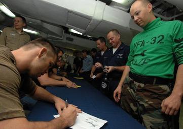 Keywords: US Navy 070713-N-8923M-164 Ultimate Fighting Championship (UFC) fighter Rich Franklin signs his name for a Sailor during an autograph session on the mess decks aboard Nimitz-class aircraft carrier USS Harry S. Truman (CVN 75).jpg en ATLANTIC OCEAN July 13 2007 - Ultimate Fighting Championship UFC fighter Rich Franklin signs his name for a Sailor during an autograph session on the mess decks aboard Nimitz-class aircraft carrier USS Harry S Truman CVN 75 Dr Michael Gervais President of Pinnacle Performance Center Inc ; UFC fighters Rich Franklin and Mike Pyle; and UFC referee Big John McCarthy visited the Truman for two days to help increase morale for the Sailors Truman is underway in the Atlantic Ocean participating in the Composite Training Unit Exercise COMTUEX in preparation for deployment to the Persian Gulf U S Navy photo by Seaman Kevin T Murray Jr RELEASED 2007-07-13 070713-N-8923M-164 Navy http //www navy mil/view_image asp id 48295 U S Navy photo by Seaman Kevin T Murray Jr PD-USGov-Military-Navy Aboard USS Harry S Truman CVN-75 Rich Franklin