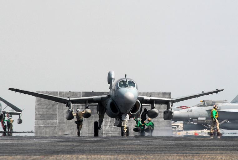 Keywords: US Navy 070720-N-8119R-083 An EA-6B Prowler, assigned to the Black Ravens of Tactical Electronic Warfare Squadron (VAQ) 135, lowers its wings while Sailors do last minute safety checks before launch aboard nuclear-powered aircr.jpg en PERSIAN GULF July 20 2007 - An EA-6B Prowler assigned to the Black Ravens of Tactical Electronic Warfare Squadron VAQ 135 lowers its wings while Sailors do last minute safety checks before launch aboard nuclear-powered aircraft carrier USS Nimitz CVN 68 Nimitz Strike Group and embarked Carrier Air Wing CVW 11 are deployed in the 5th Fleet area of operations conducting maritime operations and supporting the global war on terrorism U S Navy photo by Mass Communication Specialist 3rd Class Gretchen M Roth RELEASED 2007-07-20 070720-N-8119R-083 Navy http //www navy mil/view_image asp id 48588 U S Navy photo by Mass Communication Specialist 3rd Class Gretchen M Roth PD-USGov-Military-Navy Grumman EA-6 Prowler aircraft carrier launches Aboard USS Nimitz CVN-68 |
